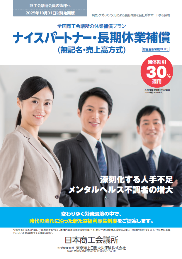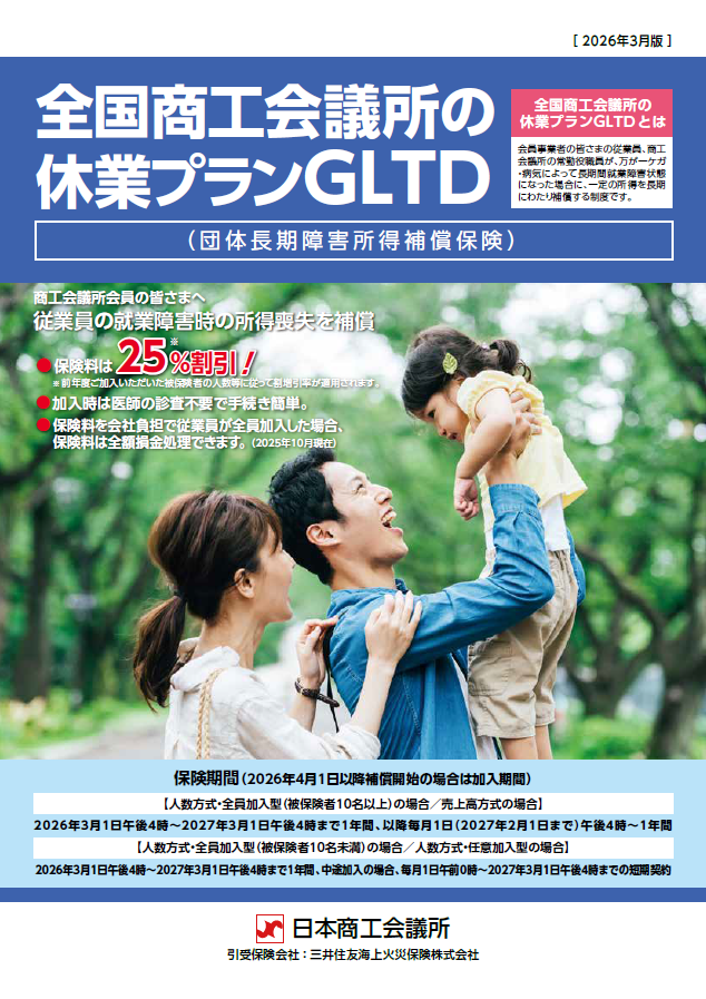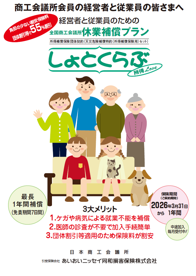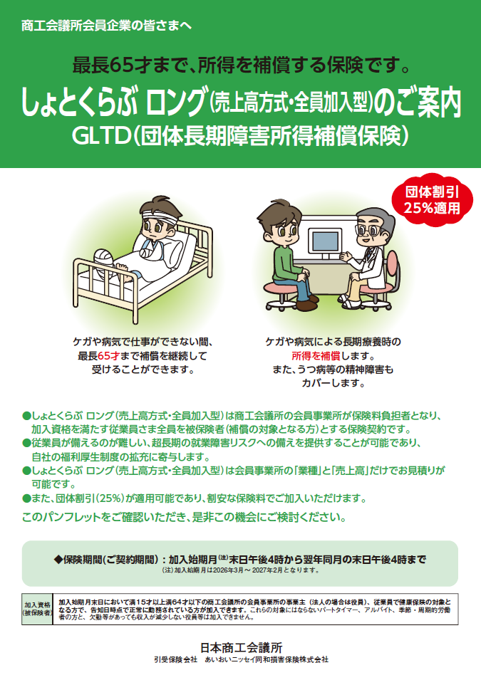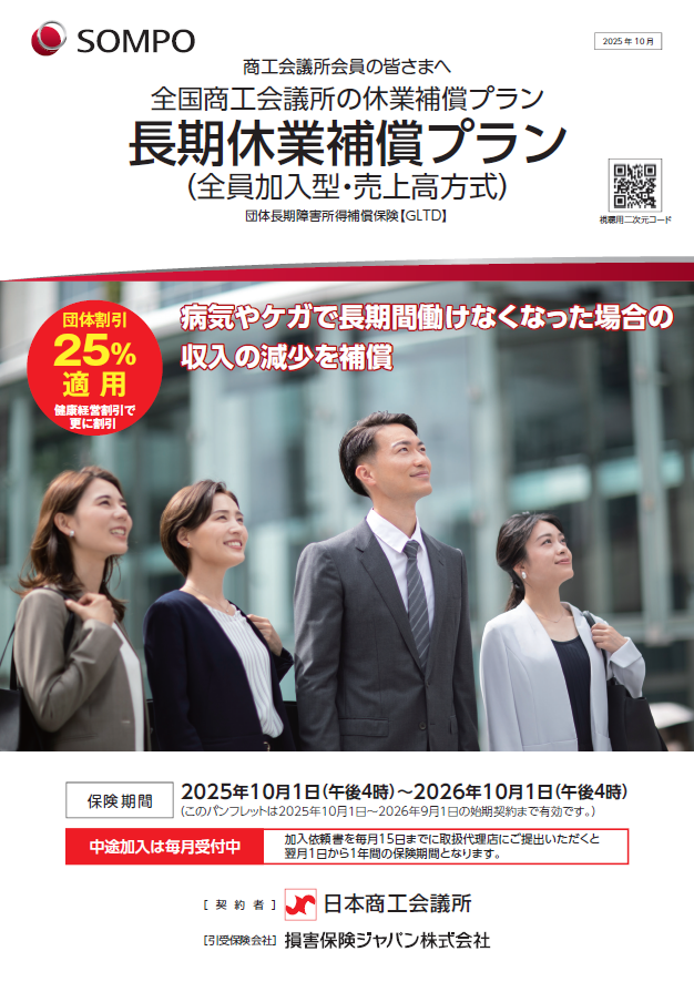 経営者本人とその従業員が、病気やケガで働けなくなった場合に、休業前の所得と公的補償の差額をカバーする(生活水準を落とすことなく、安心して療養に専念できるように設計した)もの(所得補償)です。本プランは、従業員の福利厚生の充実はもちろん、経営者本人の万一の備えにも利用できる内容となっており、公的な社会保障制度(政府労災保険の休業補償給付など)というセーフティーネットのない自営業者も加入できます。